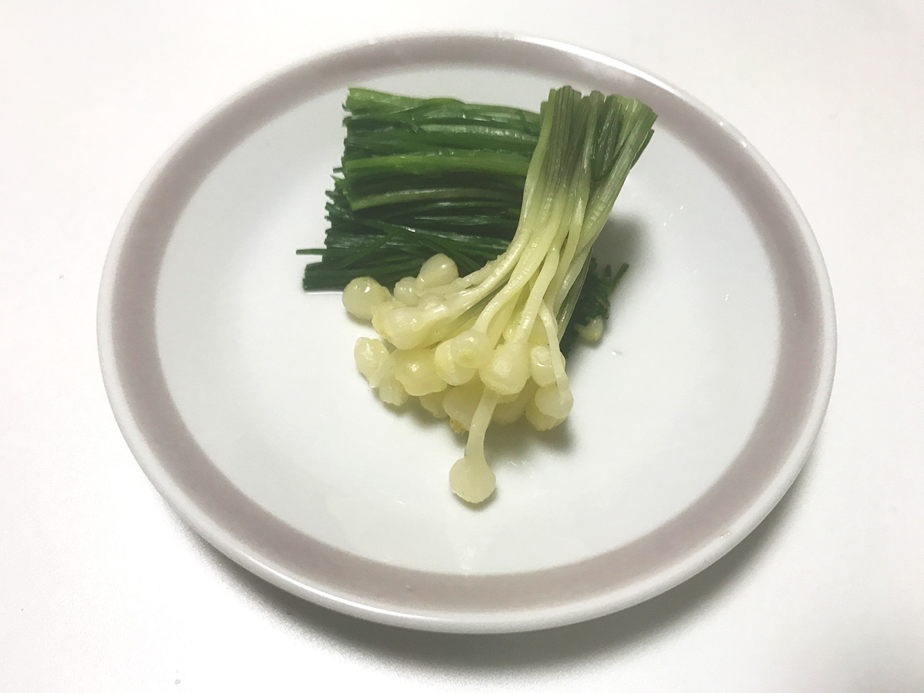 帰宅してみると、根をちぎりさっと洗えばすぐに調理できるクレソンに比べ、ノビルは大変厄介であった。葉の先の枯れた部分を取り除き、球根の皮をむく。数があると手間になる。小さな株も欲張ったせいで一袋処理するのに40分は苦手な単純作業に勤しむ事となった。ノビルはなるべく大きく葉の先まで青いものを採取すると後が楽である、ということが明らかになった。