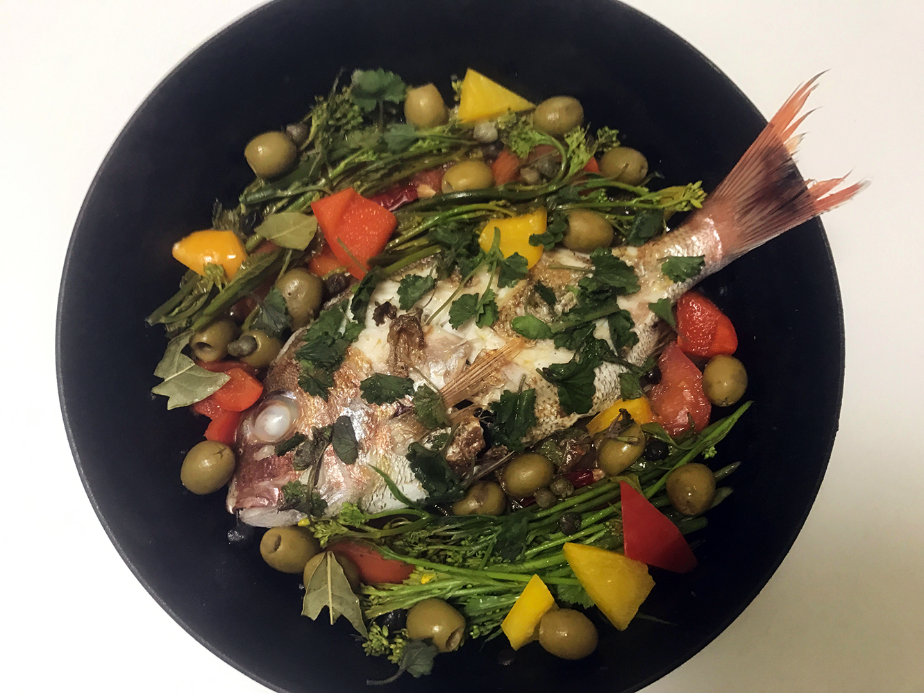 - フライパンに白身魚いれ両面に軽く焼き色を付ける。