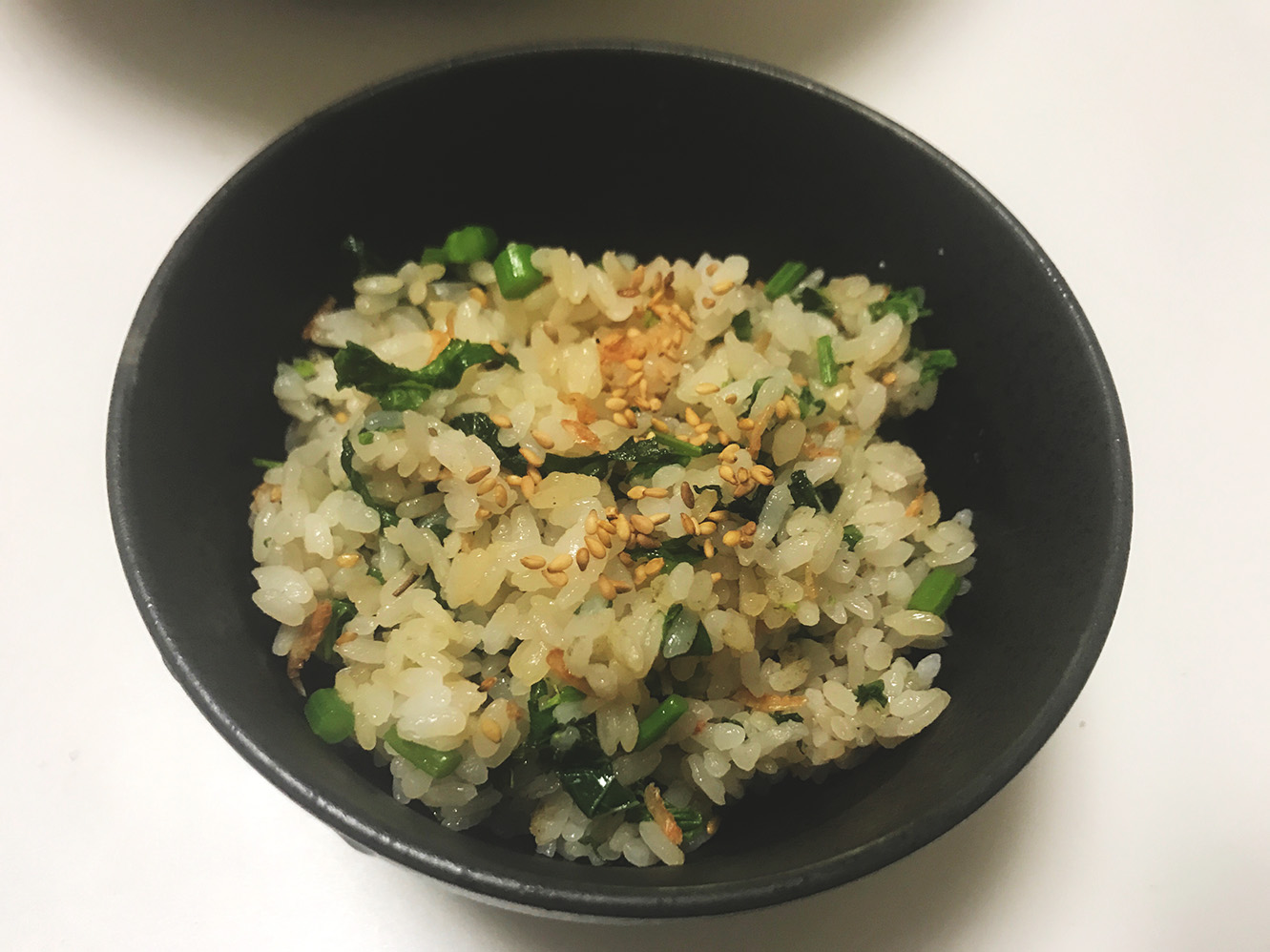 - 炊きたての白米、小エビの干物、カボスの絞り汁3、醤油、日本酒少々と混ぜ込む。