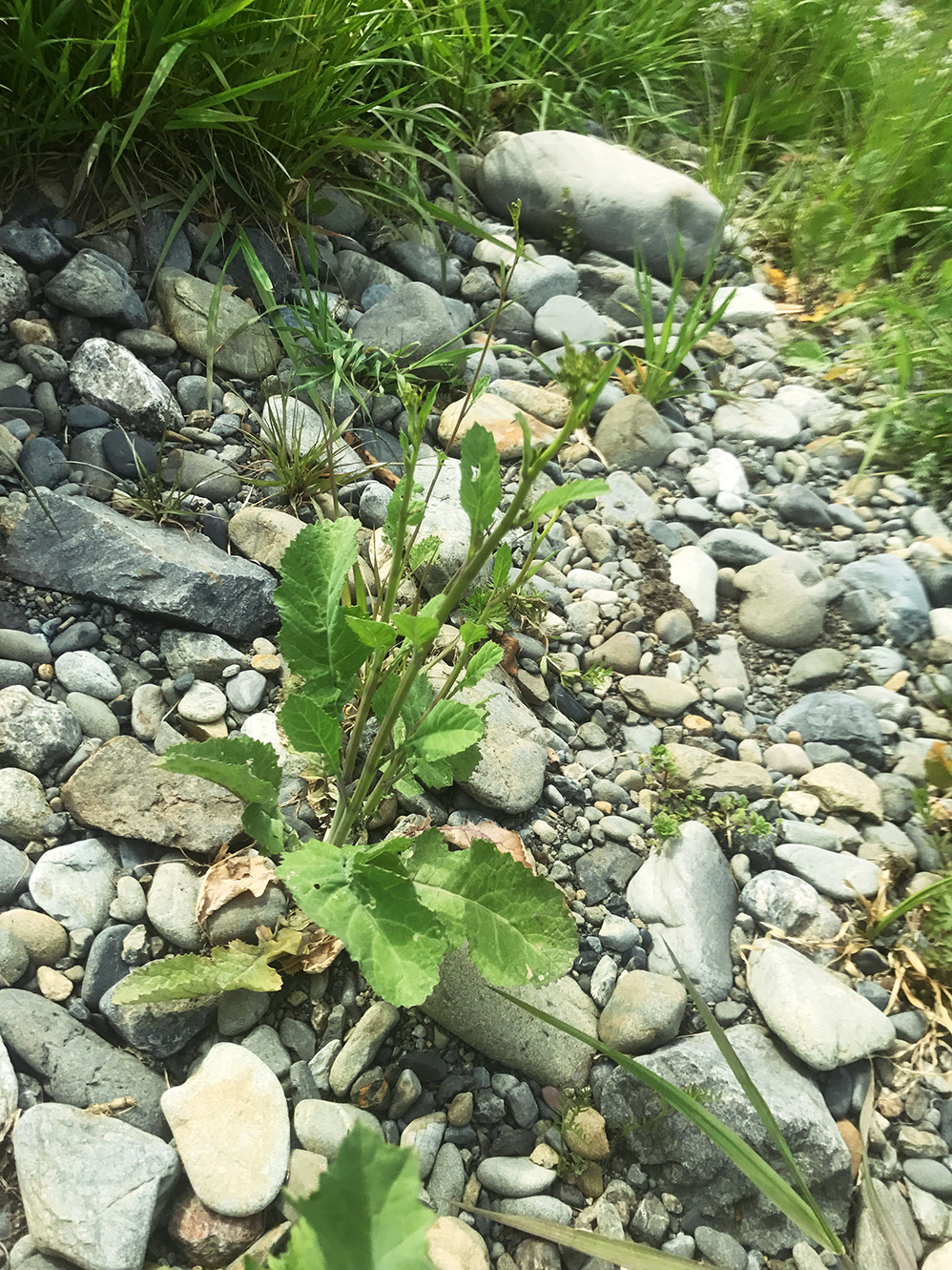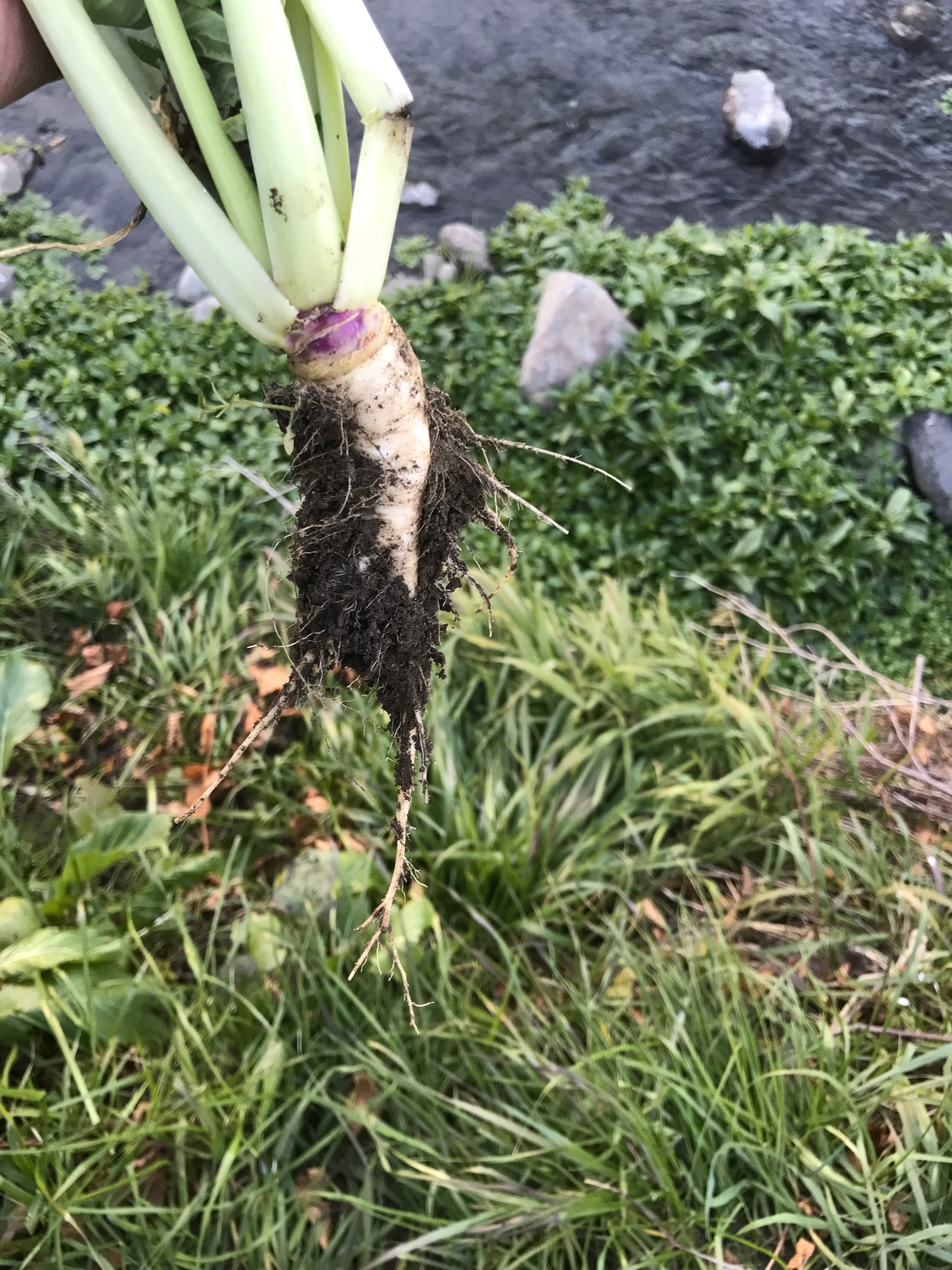 とはいえ手ぶらで帰るのも寂しい。日が落ちないうちにと10分ほどの距離にある河原へ向かう。テトラポッドを越えた中洲のあたりに、深緑色のこんもりとした葉が固まっている。1枚30cmを超えるアブラナ科らしき葉の形と半円状の茎。根本をつかみ持ち上げてみる。水辺で土も柔らかいためか、10センチほどの白く太い根がスルリと抜け出る。大根と似た辛味を帯びた匂いが顔を近づけるまでもなく広がる。食欲が湧いてくる。根はどう見ても大根の子供のような風体だが、葉の形は明らかに異なる。調べてみると、どうやら冬の間ロゼットとなっているセイヨウアブラナとのことである。もちろん食べられる。嬉しくなってもう一本抜いている間に同行者がしれっと3本ほど持ってきてくれたのがありがたい。あまり取りすぎると春に菜の花を食べそこねてしまうのでこのくらいとする。帰宅後に試してみるとやはりアブラナの葉は見た目通りアクの強い大根といった風情である。おひたしには向かないが、茹でた後で炒めたり汁物に入れる分には申し分ない。根はきんぴらにすれば食べられる。正月の野菜高に嬉しい援軍となった。