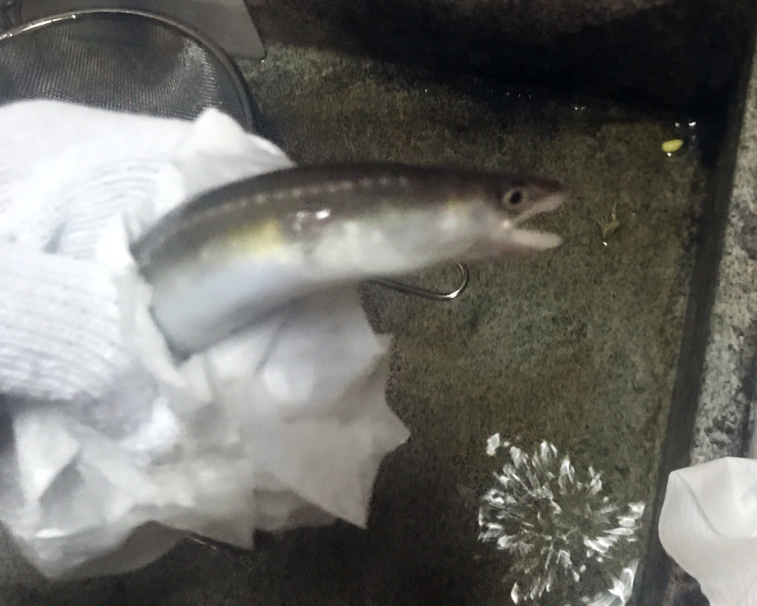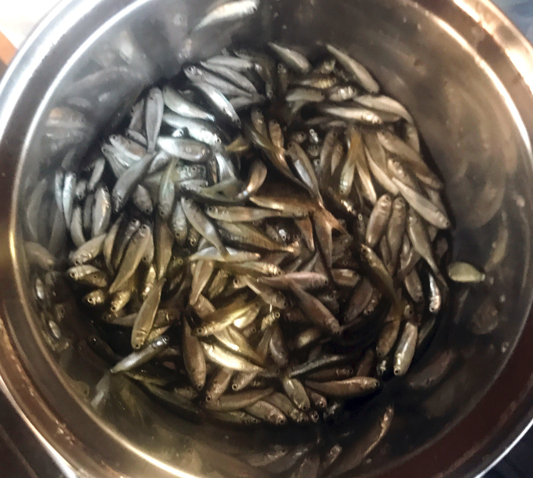 日も落ちて「ジコセキニン」が鳴りを潜めだすと、ベイカ5にハゼ、カレイの稚魚などがかかり始める。ようやく現れた1cm超えの獲物である。はじめの内は串を打って屋外の焼き場で塩焼きなどにしてはしゃいでいたが、量が取れるのでトマトで煮込んでいただくこととした。嬉しかったのはシラウオである。高級魚であるし獲れたてをいただくのは初めてである。時折網にかかったので、おそらく同行者にも行き渡ったと思う。