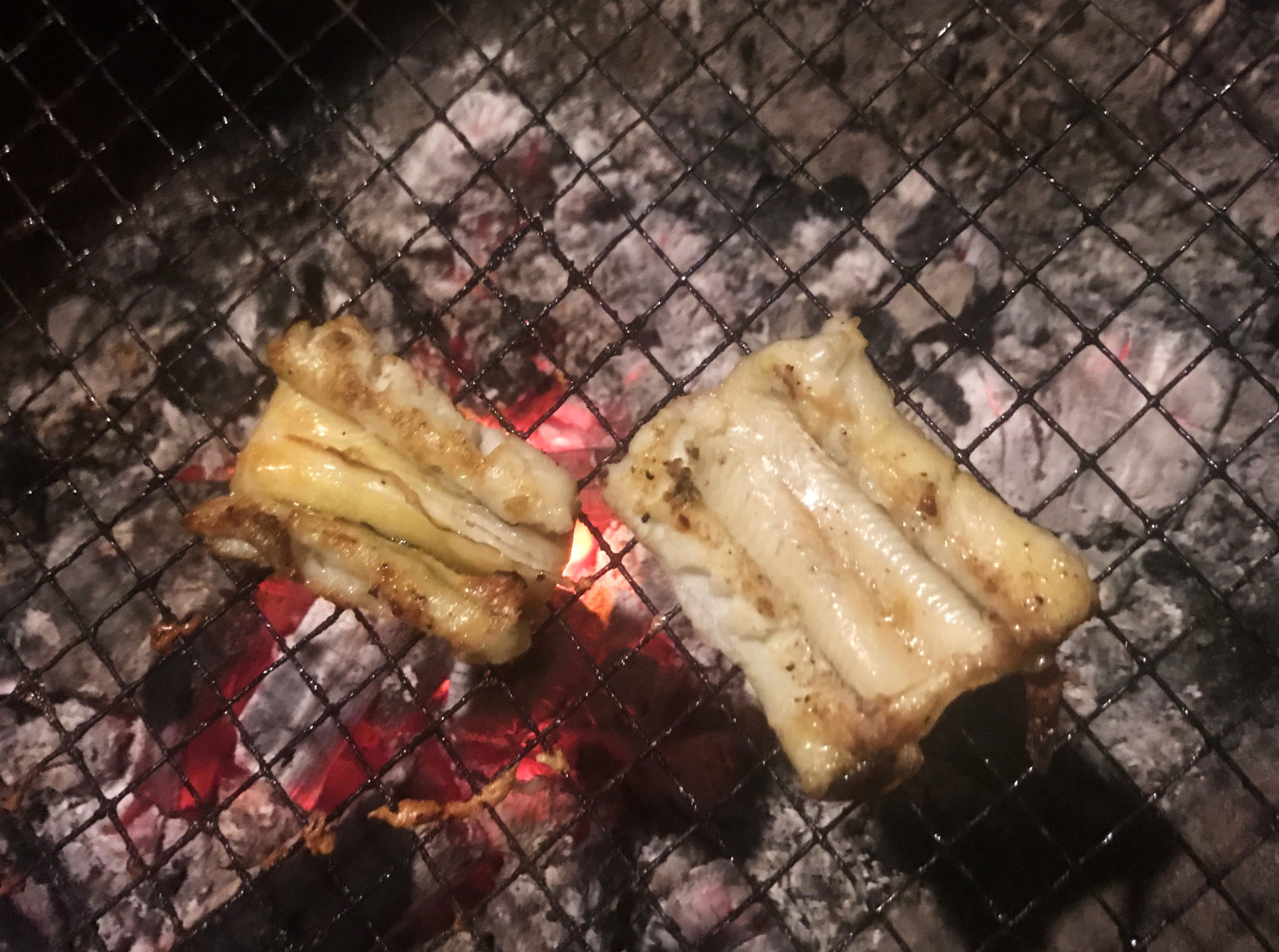 そんなこんなで夜はふけて23時前、小屋の中から叫び声が発せられる。向かってみれば、長細くうねる体に鋭い牙、その割に愛嬌のある表情。アナゴだ。非常に嬉しいが、難しい。ぬめりが強くよく暴れるため掴むことができず、〆るのがまず困難。目打ちと木製のまな板があればいくらか楽になるのであるが、残念ながら準備をぬかっていた。その上アゴの力が非常に強く噛まれると洒落にならない。軍手をつけた上でキッチンペーパーを何度も替えたところでようやく、40cmはある体から頭を分離することに成功した。そこから先はぬめりを落とし、背開きにした後、背骨をおろす。ワタを外して酒と塩を振って休ませたところで仕込みは完了である。身は白焼き、中骨は炙って骨酒、ワタはさっと湯がいてポン酢漬けで頂く。ぐったり疲れた甲斐は十分にあった。