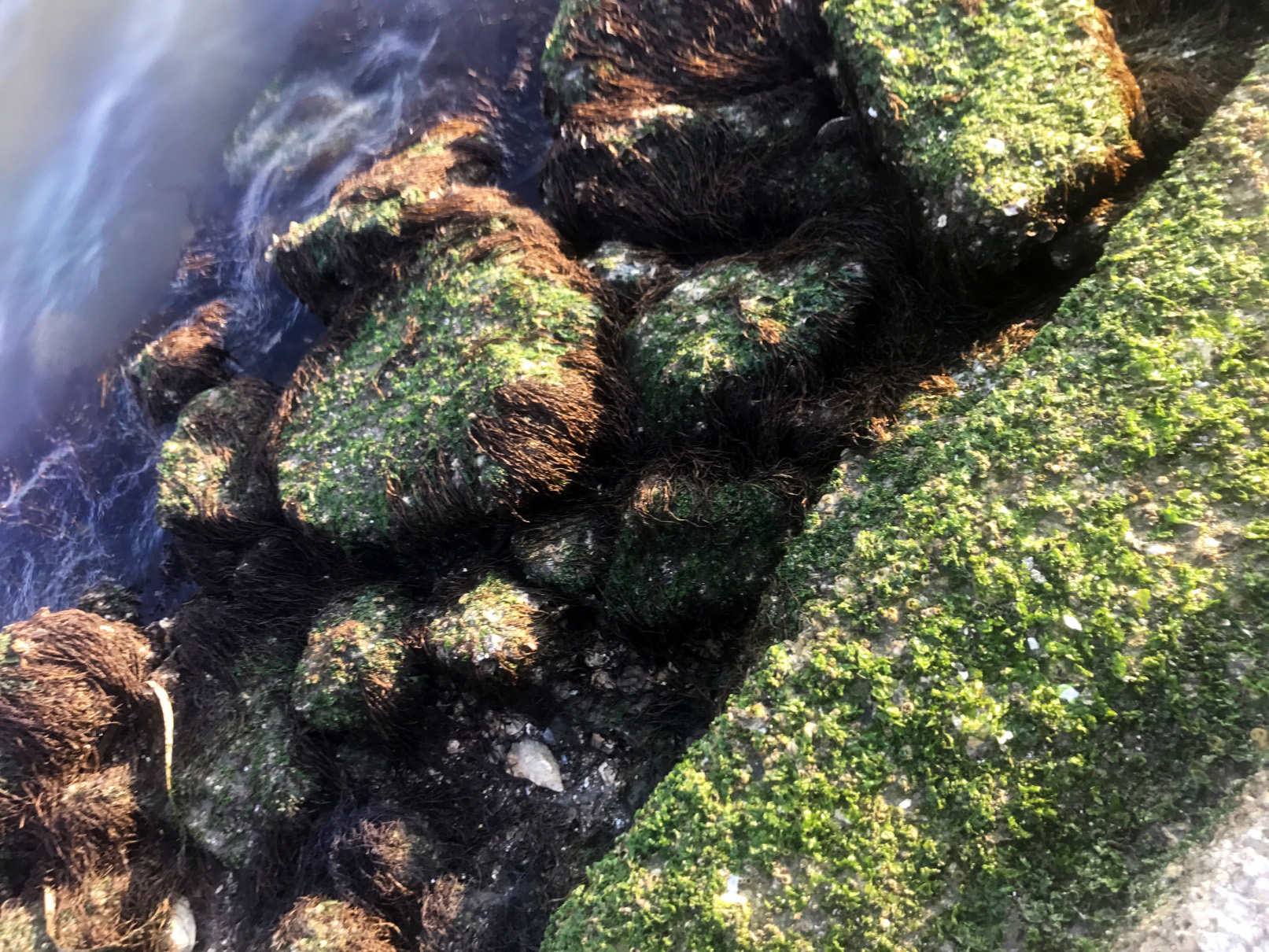 ようやく3日目、新幹線で来た悪友連中と合流後、四つ手網のある小屋にて網のオーナーより説明を受けているとどうにも気になるものがある。水際のコンクリートに張り付いた、緑色の薄いひらひらとした海藻。母の実家房総の辺りではこれを剥がして食べてはいなかったか。アオサに見える。聞いてみるとアオノリであった。近くに養殖場があり種が流れてくるそうである。ついでに近くに生えている細く茶色い海藻はオオノリといって、茹でれば食べることができるという。刺身のツマの細い緑の海藻の正体だそうだ。これで魚がとれなくとも、最悪食べるものは確保できる。魚が取れるのは夕方からだそうなので、暇そうにしている友人を手伝わせノリ集めに励むこととした。湯がいたノリは冷水で締め、地元のスーパーで目についた味噌ポン酢と香味野菜で和える、悪くない小鉢ができた。