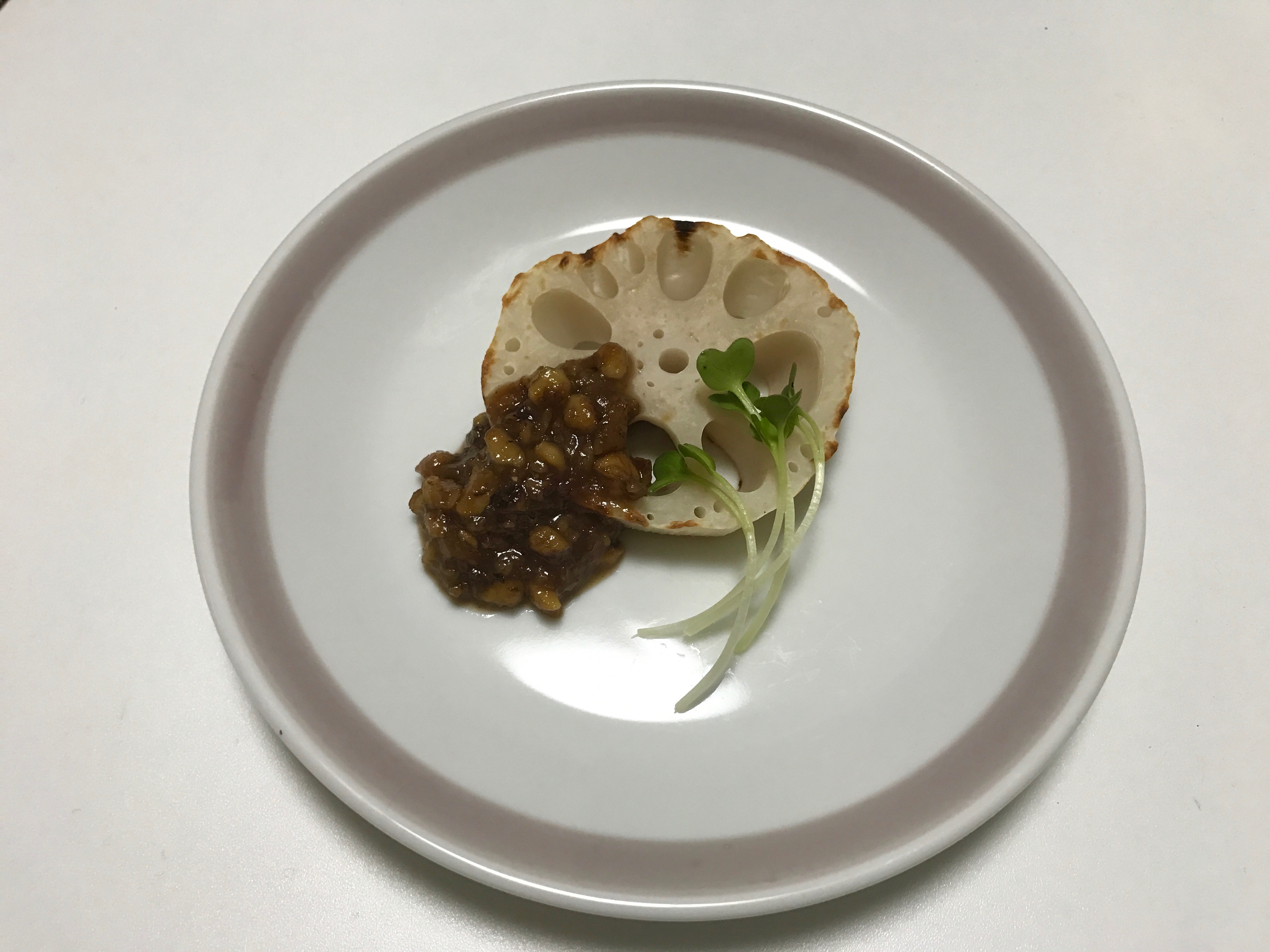 - 焼き上がったレンコンにクルミ味噌をかけてできあがり。