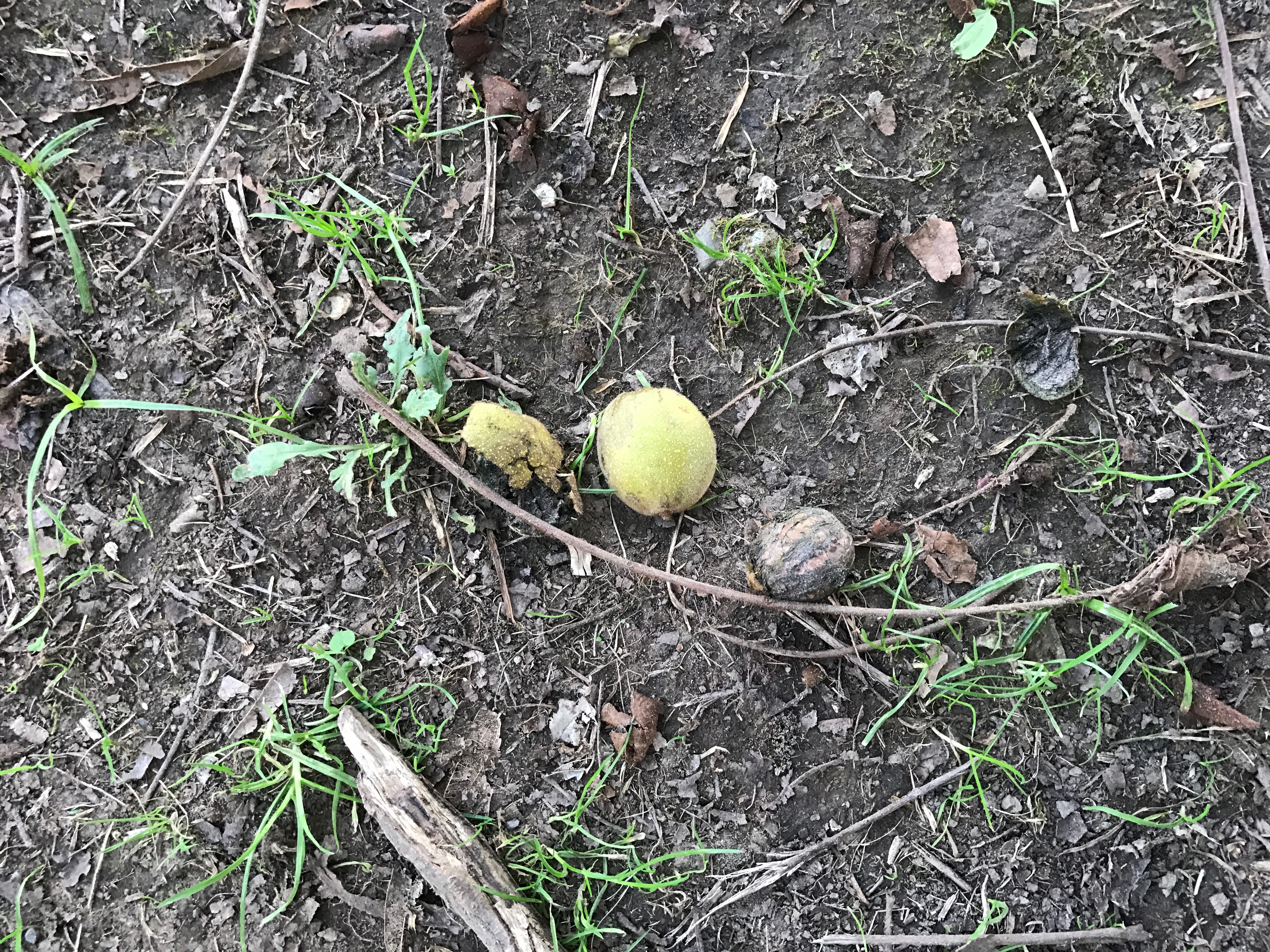 ようやく たどり着いてみると、木には既に緑色の実はついておらず地面にも実の落ちた形跡はない。クルミの木には雌雄の別があることを思い出し、気を取り直して別の木を探す。程なくして3、4本のクルミの木の集まる箇所にたどり着く。木にはやはり実はついていない。悔しいので地面を注意深く観察してみると、ゴツゴツした茶色い塊を見つけることができた。形からしてオニグルミで間違いないだろう。実は十分腐り落ちているようで剥がす手間もかからなそうだ。目がなれてくるとそこかしこに落ちているようで、程なくして20個ほどのオニグルミが集まった。実が青みをおび腐りきっていないものも大分あったので、これらは今暫く放置することとする。
