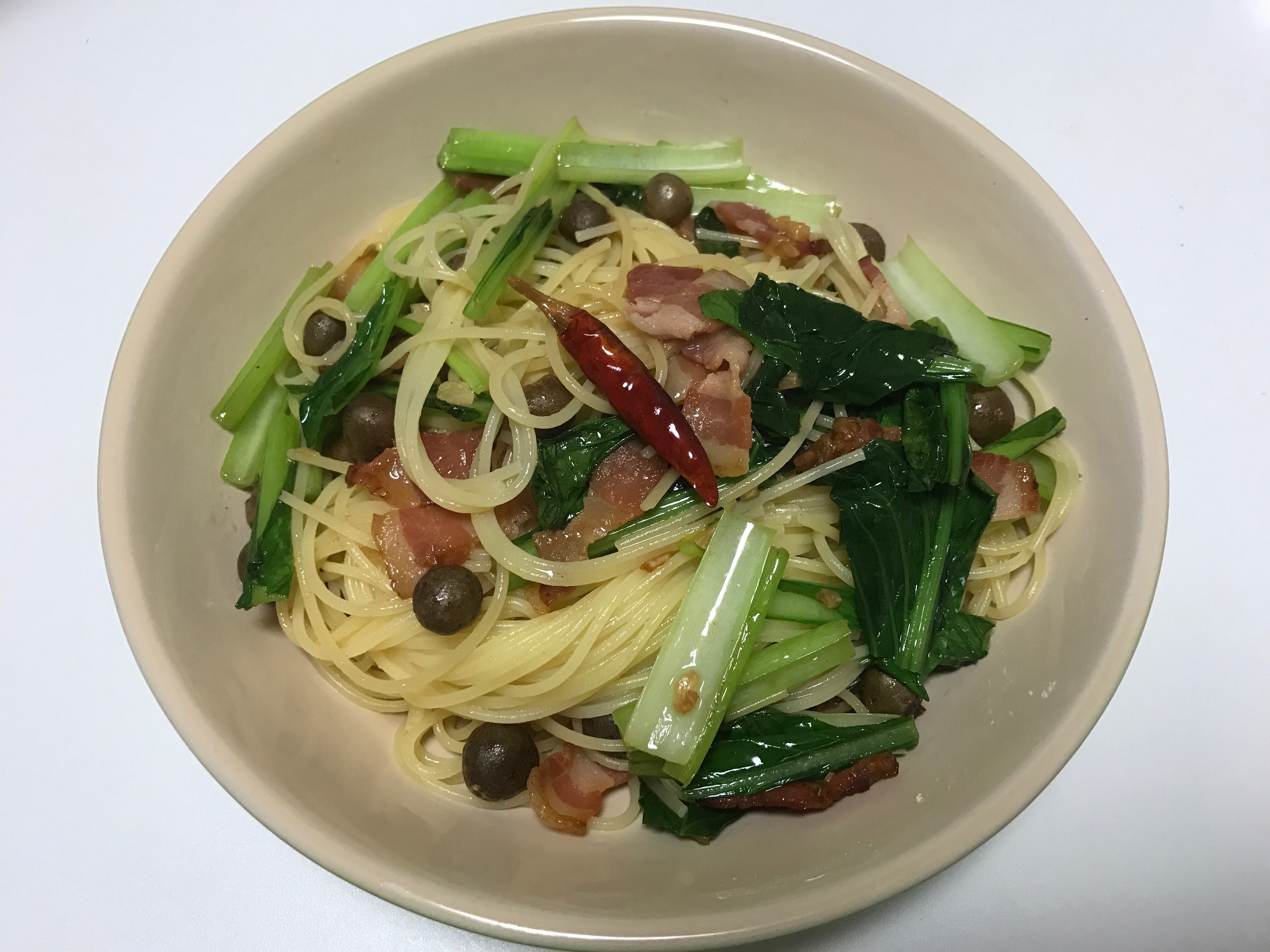 - 3cmほどに切った小松菜を合わせさっと炒め、スパゲッテイの茹で汁を足す