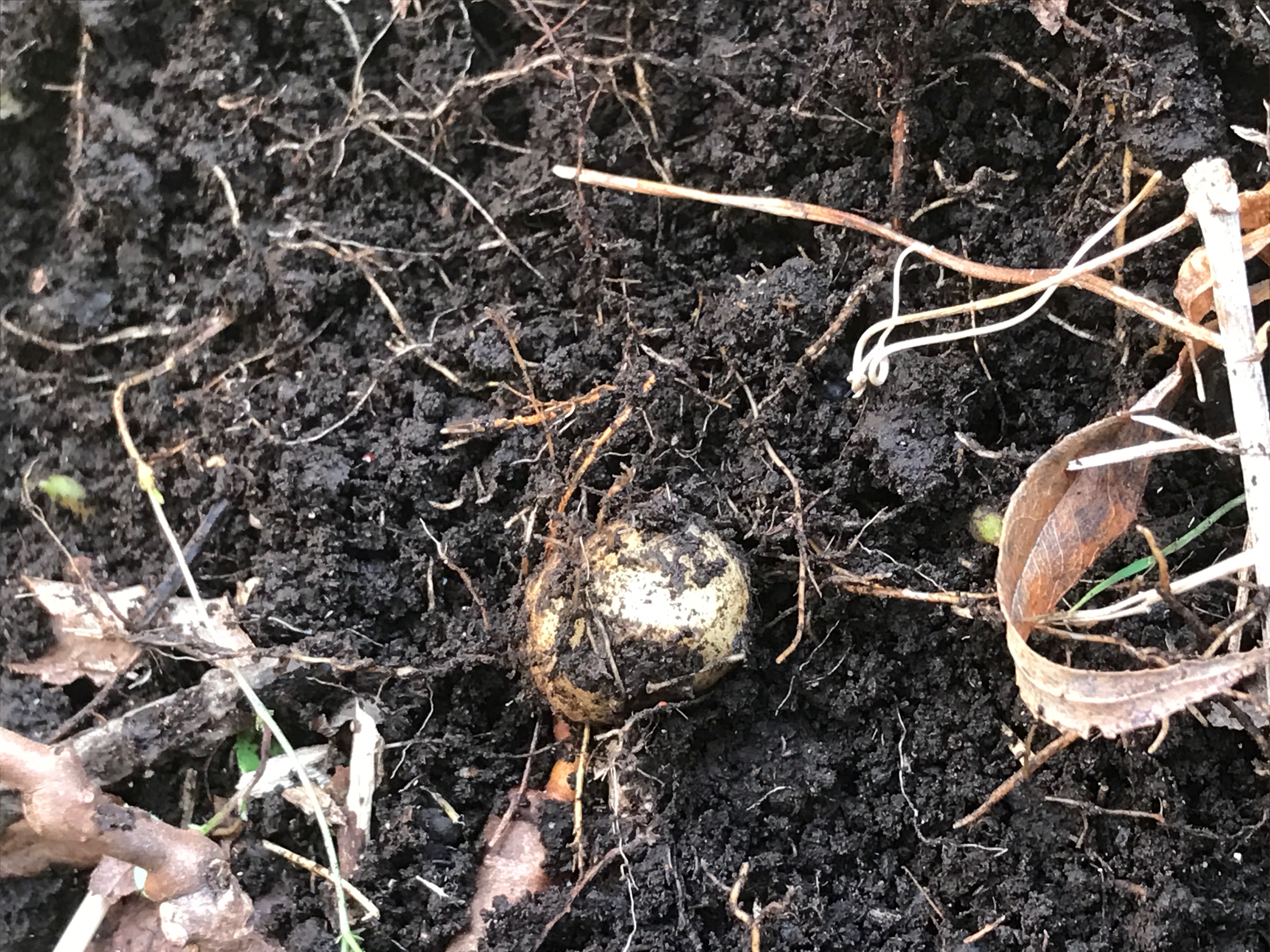 年が改まって1月頭、ムカゴの話で盛り上がった知人4とヤマノイモの生えるポイントを再訪する。ツルの根本をたどれば自然薯が手に入るだろうという目論見である。幸い天気もよく凍えることはなさそうだ。たどり着いてみれば、葉はかなりが枯れ落ちツルだけでは随分と判別しづらくなっている。仕方なくツルの巻き方を頼りに根本をたどるも、途中で切れてしまっていたり、伝っている間に切れてしまったりと道のりは困難を極めることとなった。ようやくそれらしき箇所にかがみ込み、シャベルを手に取る。しばらく掘ると2センチ程度の小芋のようなものが現れる。これは幸先が良いと堀り進めるが、少し進むと木の根が現れ、木の根をよけると硬い石、となかなか本体にたどり着かない。しまいには根も見失ってしまった。同行者は根気強く計5箇所ほど付き合ってくれたが、ついぞイモの根の本体に出会うことなく日が陰り始めてきた。体が足元からだんだんと冷えてゆき、関節が固まり始める。ヤマノイモの根の本体を探すのであれば日が長く葉も青い季節のうちに大きなシャベルを担いで行く必要があるようである。結局3つばかりしか取れなかった小芋は将来に期待して埋めることとした。
