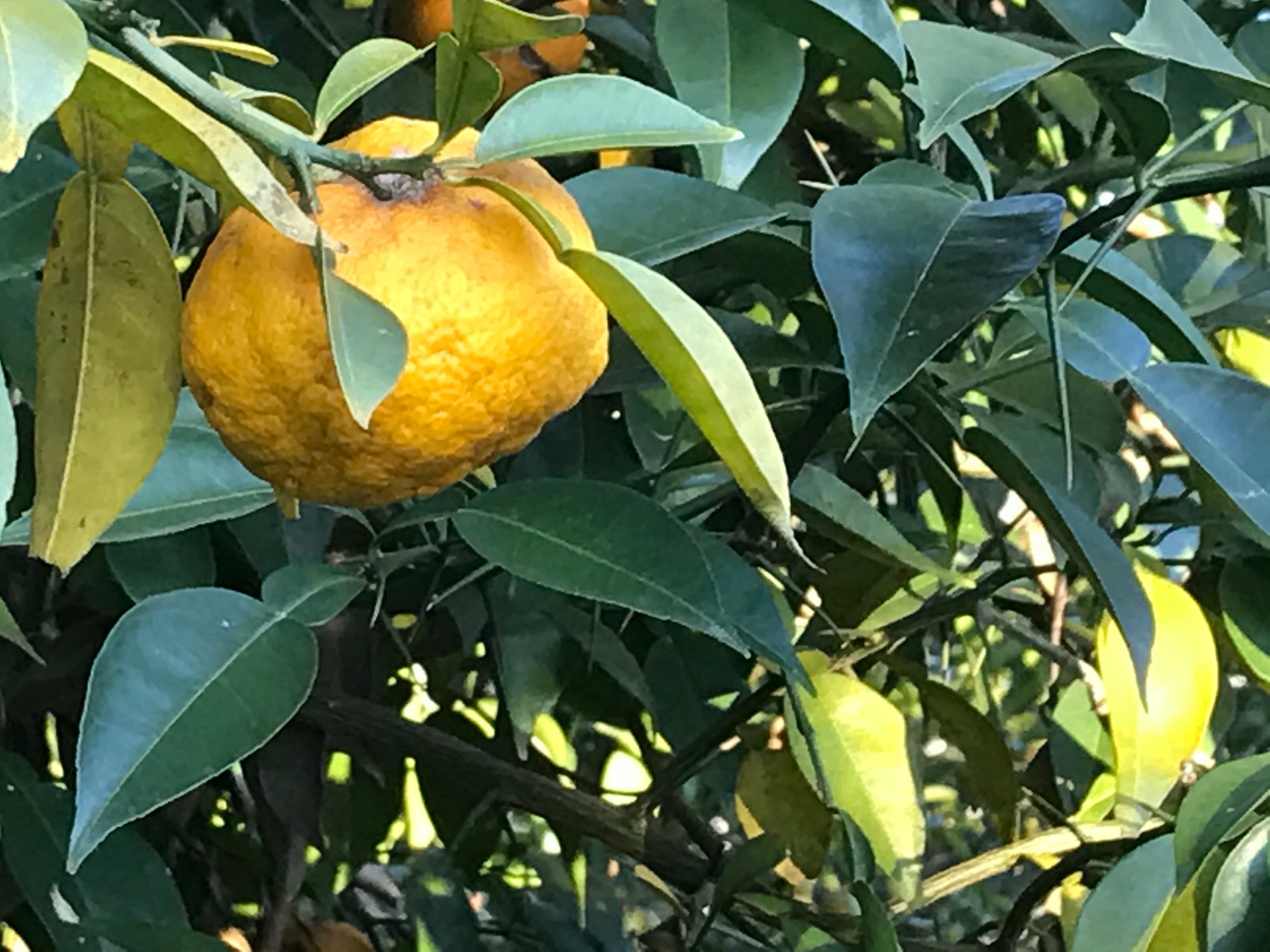 私有地以外に柑橘の木はないかと半日ほど自転車を走らせていると、無料でユズを配布している台を見つけることができた。自生する木になる実を見つけられなかったのは悔しいが、日没も近いのでいくらか頂いていくこととした。刻んでも薬味にしても、絞って煮物や鍋の香り足しにも使える万能選手である。どれを持ち帰ろうかと悩んでいると、ほっかむりをした女性に声をかけられた。話してみるとユズの木の持ち主だそうで、「最近の若い人はやったことないだろうから」とユズで作る酢味噌のレシピを教えてくれた。皮をおろして用いる我が家のふろふき大根用の柚子味噌と比べ、千切りまま混ぜ込んだユズの香りと食感が全面に出てくる。聞いた通り、ご飯に乗せても、こんにゃくに掛けても悪くない。ものの試しと小ねぎの茹でたのにも掛けてみたのだが筆者はこれが気に入った。後日、別のエリアの公園にて鈴なりになったナツミカンを見かけたので拾ってみたが、こちらは時期が早いらしく酸味が非常に強い。名前に夏とつくだけあって、見た目は立派に見えても食べるにはまだ早かったようである。誰にも取られず木になったままとなっていたのも道理といえる。調べてみれば追熟も可能なようなので、こちらは貰い物のりんごの入った箱において様子を見ることとした。