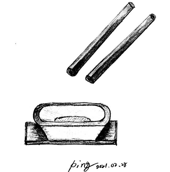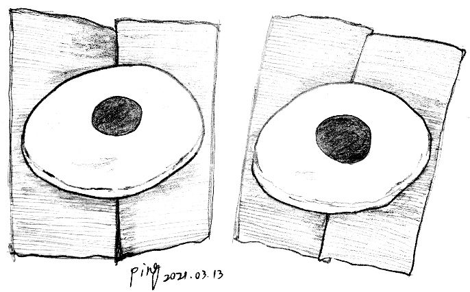 そんなことも知らずにやってきた三番目の婿は、今年はもち米を蒸して作った二つの大きな丸いお餅(イラスト1、2)を携えていた。彼はお祝いのための祭壇にお手製の餅をどさっと置いた。それを見るや否や、金持ちの婿たちは大笑いしながら罵った。