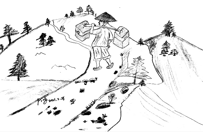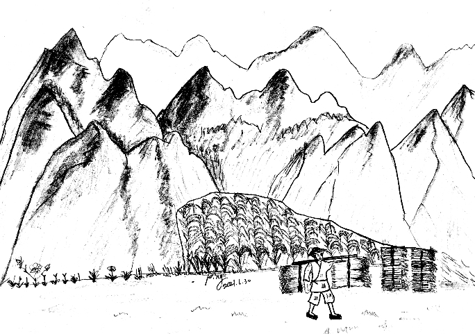 「おかしいぞ。なんで終わらないんだ。まあいいや、ひとまずこの稲を家に持って帰るか。着いたら稲こき2もしなきゃいけない」とイビャーは独り言をつぶやいた。ところが、刈った稲があまりにも多くて、イビャーは一度に天秤棒で担ぐことができなかった。運べなかった稲は束にして畑の端に置き、明日の朝取りに来ることにして、いくらか担いで家に帰った(イラスト1)。