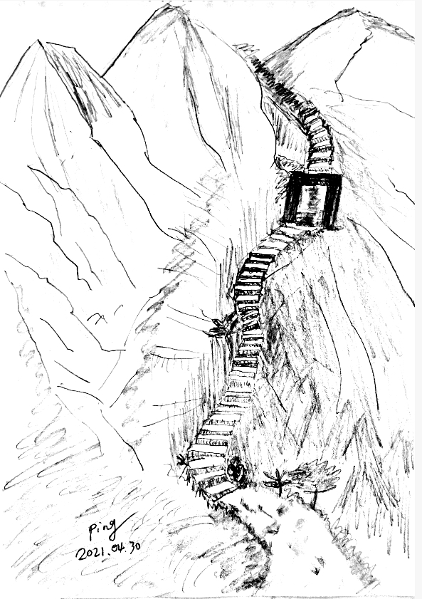 今の龍茗の役場の裏手には高い山があって、今は八仙山(はっせんざん)と言っているが、昔はピャーゼー(遮る山1)と呼んでおった(イラスト1)。村の古老によれば、あまりにも高く、木も行く手を阻むように生い茂っていたそうな。そのため、山の頂上には猿ぐらいしかたどり着けなかった。天と地を分かつかのように見えたからそういう名前がついた。