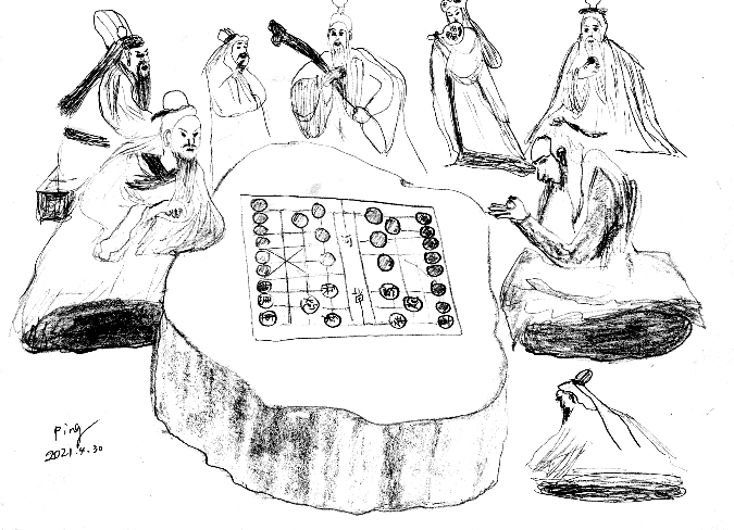 「かまわんよ。「将棋を見て口を挟まず、これ真の君子なり」という諺もある。君は物分かりがよくて、ありがたいよ。私たちはな、天から来た仙人じゃ。毎日ここで将棋を楽しんでおるのじゃ。今日はこれで終いでの、天宮に帰るところじゃ。どうか若者よ、我らと一緒に天宮へ行かんかね」