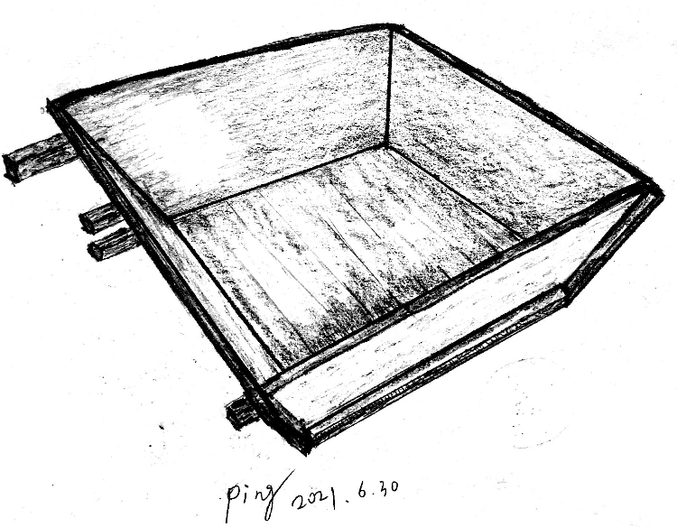 家に着いたイビャーは、稲を打穀樽(イラスト2)の横に置いた。そのとき、さっき畑の端に置いてきたはずの稲の束が突然打穀樽のそばに現れた。それを見てイビャーは驚いたが、それ以上にあまりにもお腹が空いていてそれどころではなかった。彼は晩ご飯を食べてから脱穀しようと考えた。