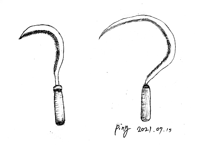 チワン族地域では刃の部分が半月形に大きく彎曲した鎌(右)と比較的彎曲の程度が小さい鎌(左)がある。両方ともチワン語で[liːm31]と言う。田中(1991:319-320) によれば、タイ国でも刃の部分が半月形に大きく彎曲した「彎曲鎌」と比較的彎曲の程度が小さい「三日月鎌」が使われているという。