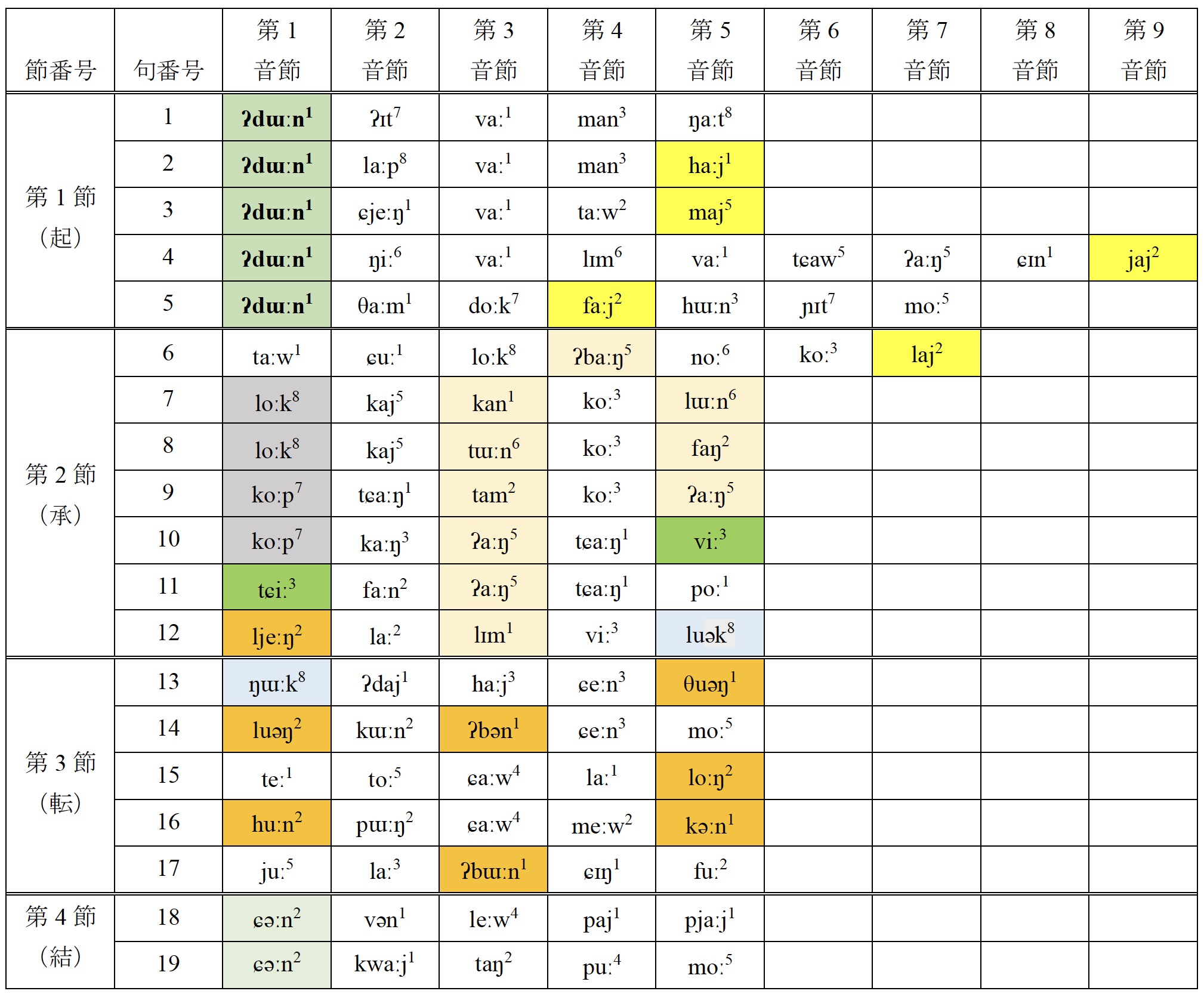 図2 班桂英氏の1番目の歌の押韻体系(同じ色は同じ韻として認識されるもの)