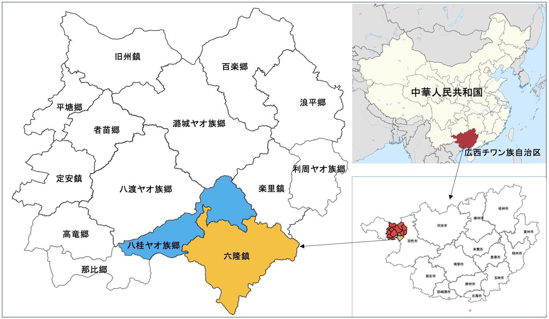 動画資料の歌唱者は盧万香氏(男、1972年生、初めて本連載に登場する歌手)と班桂英氏(女、1973年生)である。盧万香氏と班桂英氏はともに田林県の出身だが、班氏は八桂ヤオ族郷八桂村六胡集落(地図3の青の地域)、盧氏は隣の田林県六隆鎮小欖村(地図3の黄色の地域)の生まれである。撮影者は周祖練氏、撮影日時は2023年2月18日で、撮影場所は八桂ヤオ族郷八桂村六胡集落にある班志明氏(百日祝いのご主人、班桂英氏の実家の親戚)の自宅である。