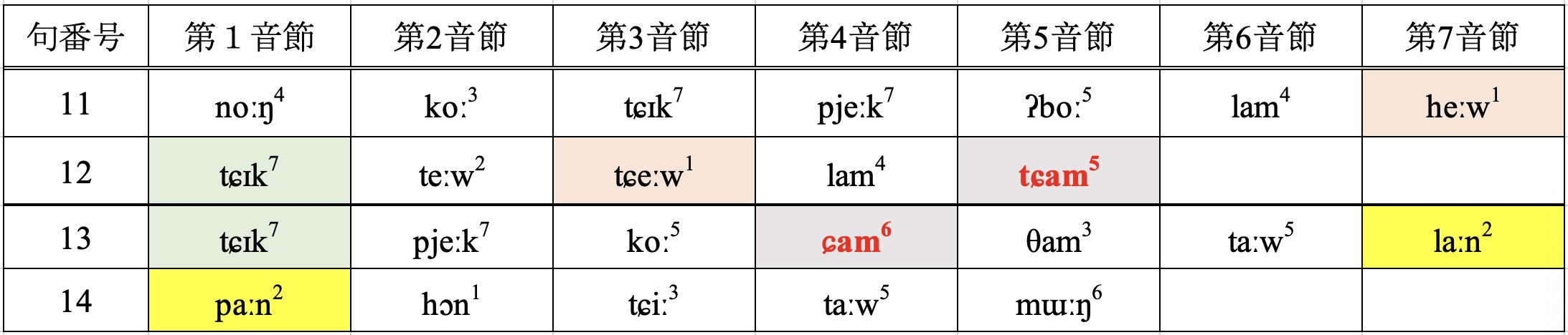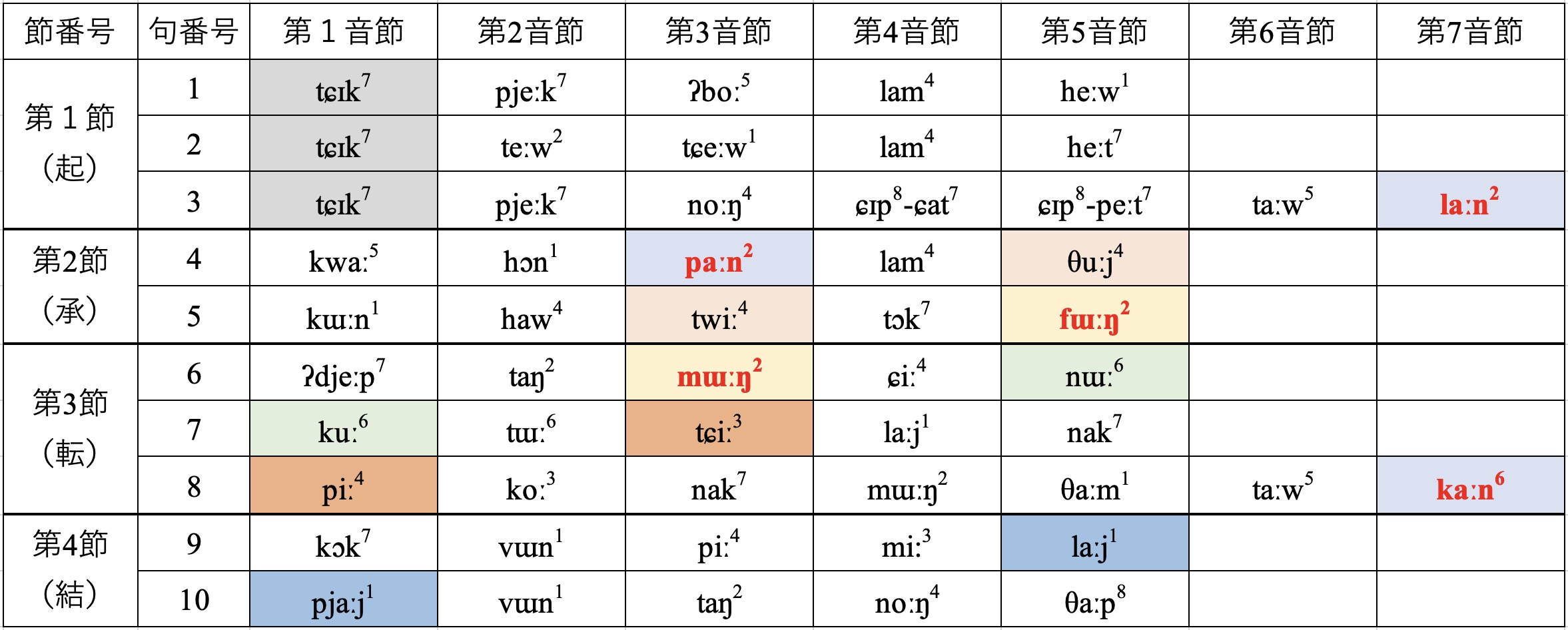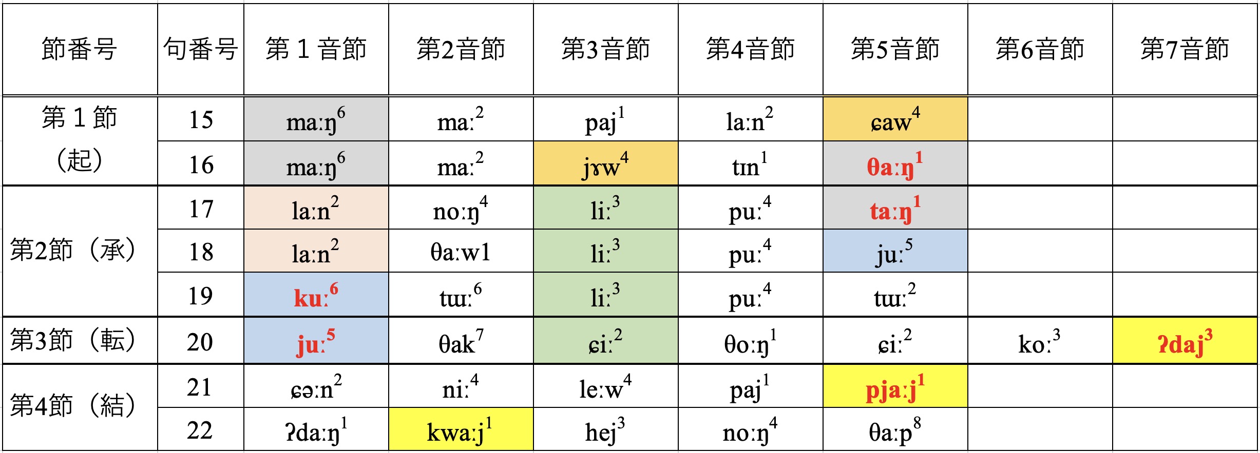 図3 陸代発氏の2番目の歌の押韻体系(同じ色は同じ韻として認識されるもの)
