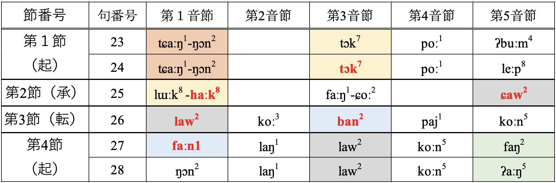 図4 班桂英氏の2番目の歌の押韻体系(同じ色は同じ韻として認識されるもの)