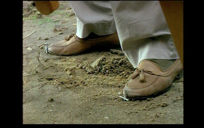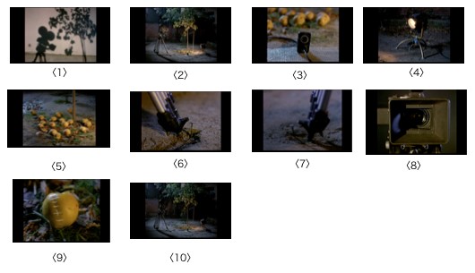数字順にシーンが進む。ピーという音とフィルムの回る音がするとマルメロの木とカメラの影がしだいに白い壁に映る。そして画面全体が暗転する。夜のアトリエの庭が映る。そこには35ミリフィルムカメラと照明がある。このカメラと照明はロペスが設置したものなのかどうかはなにもわからない。照明とカメラはタイマー自動撮影により連動していて、照明から光が出ると同時にカメラのフィルムがカラカラと回転し始める。照明の光に照らされるマルメロの実をカメラは撮影していると思われる一方、ロペスが絵を描くときのようにカメラはマルメロの実を撮影しているとも思われる。カメラはマルメロの木に向かって立ち、地面に落ちたマルメロの実の方を向いていて、それもロペスが絵を描くときに足を揃える定位置に三脚を据えているからだ。地面に釘が打ち込まれているところ、それが定位置であり、マルメロの木を前にする際、この定位置に足をしっかりと固定して構えるのがロペス固有の技芸である(この他にも固有の技芸と呼べるものがあるのだが、それはのちほど言及する)。
