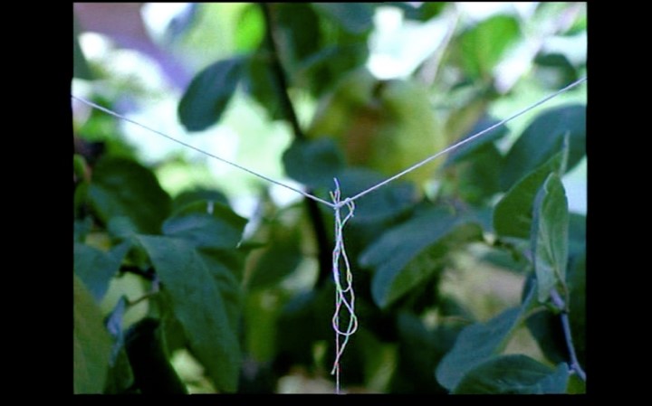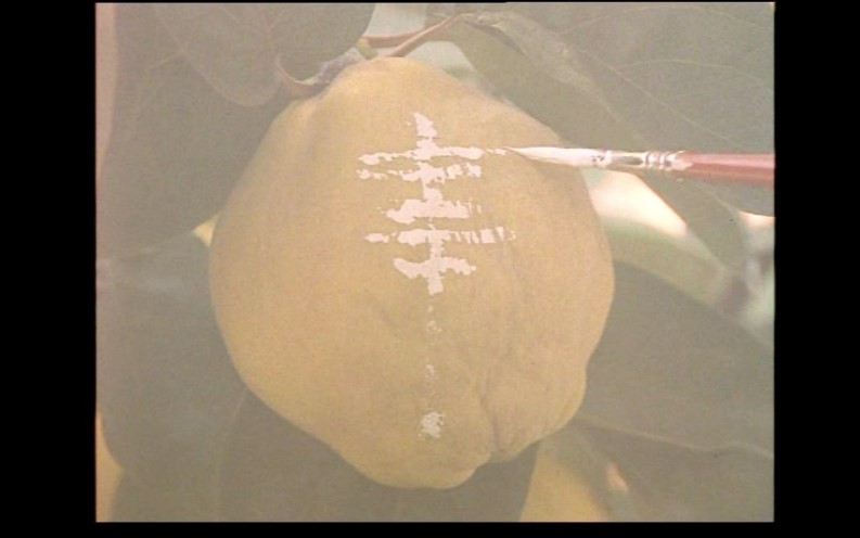 春、アトリエの庭のマルメロの木はふたたび実をつける。どの実も枝にぶら下がったままで白い柔毛に包まれている。「新しい」マルメロの実がひとつひとつ画面を切り変えながらクロースアップで映りながらどこからともなく〈ロペス〉の鼻歌が聞こえてくる。〈ロペス〉は庭にいると思われるのだけれど、どの像にもその鼻歌が結びつくことはない。そして鼻歌を残しながら画面にはマルメロの木が引きで映る。