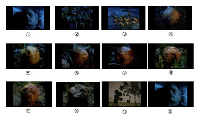 ベッドで仰向けになっているロペスの顔に月明りがしだいに射し込む。ロペスのモノローグが始まりながら画面はアトリエの庭のマルメロの木に切り変わる。そして地面に落ちたマルメロの実が画面外から「何かの光」ではなく照明の光に照らされる。③のショットは「夜庭のシーン」〈5〉のショットと同じに見えるし、マルメロの実に照明の光が射し込むときの角度も同じだ。その後いくつものマルメロの実が照明の光に照らされるのだが、照明の光が出ているということはおそらくそれと連動して画面外ではカメラも動いているはずだ。「モノローグシーン」でマルメロの実に投げかけられている視線とはこのカメラの視線である。ただしカメラが動いているのであればアトリエの庭で鳴り響くはずの、あのカラカラというフィルムの回転する音は聞こえてこない。聞こえてくるのはBGMとロペスのモノローグだけである。「トメリョソ」のマルメロの実が朽ちてゆくのをロペスが「見て」いるときに、カメラはアトリエの庭の地面の上で朽ちてゆくマルメロの実に向けられている。ロペスが「見て」いるものとカメラが撮影しているものが同じであるならば、そのときロペスの声はベッドに仰向けになっているあの「老人」というよりはむしろカメラから聞こえてくるのかもしれない。そう思ったのもつかの間、真っ白な壁にマルメロの木とカメラの影が落ちる(〈1〉のショットは⑪のショットと同じだ)。この「影」はまさしく定位置に足を固定しているカメラであり、「影」の成す特異な構えを目にするやいなや、わたしのなかではアトリエの庭に佇むカメラがロペスの声の仮想的な音源になる。そして壁を照らす照明の光が消えると同時にモノローグが止む。あたかもカメラのフィルムの回転が止まるかのようだ。