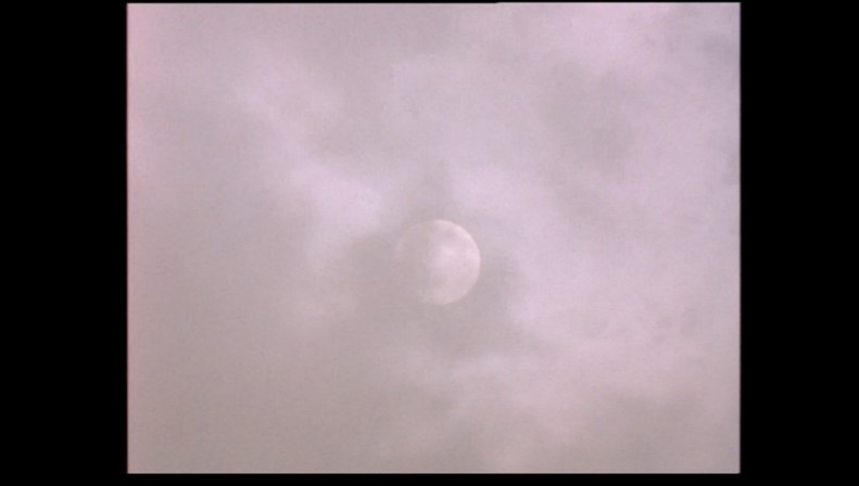 ホワイトアウトという現象が画面転換のエフェクトによるものなのか太陽の光によるものなのか判断がつかなくなっている上で、この一連のシーンにおいてマルメロの実と太陽の見かけが似てくる。まず、画面の構図上、その中央部分には十字の印が引かれたマルメロの実が位置し、下部分にはJueves 1 de Noviembreと記された字幕がマルメロの実に引かれた水平線の規則に則るかのように位置する。マルメロの実を映した画面全体に「十字の印」が引かれたような構図そのままに、ホワイトアウト後、マルメロの実が映っていた位置に太陽が現れるとほぼ同時にViernes 2 de Noviembreと記された字幕が出る。シーンが進むなかで太陽とマルメロの実は重ね合わさって見えるばかりか、ディゾルブにともないうっすらと黄色を帯びた太陽の輝きが抑えられることで、その見かけは「黄金色」のマルメロの実、あるいは、白い線が一本も引かれていないという意味で「新しい」マルメロの実に変わる9。ホワイトアウトをもたらすのかもしれない、空に浮かぶまっさらな「マルメロの実」。画面に映るその様はまさしくこの映画のタイトル通りEL SOL DEL MEMBRILLOだといえる。つまり「のdel」という属格を「マルメロの実としての太陽」という意味合いで解する、「マルメロの陽光」である。こうして「マルメロの陽光」を見出しながらも、それと同時にわたしはViernes 2 de Noviembreと記された字幕を〈字幕〉として見て楽しむ。つまり「マルメロの陽光」と〈字幕〉を〈ロペス〉やマルメロの木と同じ〈物語世界〉に属するものとして、なおかつ、どちらの光も太陽の光なのか「プロジェクター」の光なのか一切判断できないものとして見る。これから〈物語世界〉で輝く「マルメロの実としての太陽」を〈太陽〉と表記し、〈太陽〉の光を〈陽光〉と表記する。「陽光といっしょにマルメロの実を描かなきゃならんと思う」という〈画家〉の発言が「〈字幕〉といっしょにマルメロの実を描かなきゃならんと思う」という意気込みであるなら、11月2日の空を見上げ、〈太陽〉と〈字幕〉が「いっしょに」出現しているその様を〈画家〉は「描かなきゃならん」のだろう。その後〈太陽〉と〈字幕〉は「いっしょに」描かれることも撮影されることもないままに月日が流れる。そして季節は春を迎える。