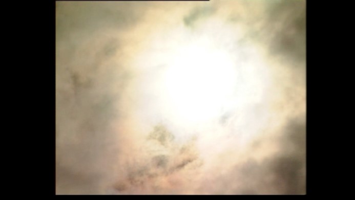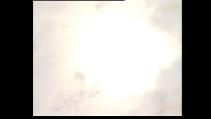 アトリエの一室を映す画面が、突然、半透明になりながら真っ白に飛ぶ。徐々に画面全体を覆う白飛びが抑えられてくるものの、画面の中央部分の白飛びが依然として鮮烈な明るさを保ちながら残留し、そして、その部分に少し雲がかかった太陽が現れる。太陽が雲に覆われることで画面を覆う白飛びが抑えられるのなら、雲の向こうに太陽が現れる段階で、ホワイトアウトをもたらした光源はこの太陽なのかもしれない。そう思う一方で、部屋を映した段階で画面全体が突然真っ白く飛び始めるときにはまたここでも画面が切り変わるときのホワイトアウトが発生し始めたなと思うことも確かだ。それゆえにアトリエの一室から空に浮かぶ太陽に画面が切り変わる際に起きるホワイトアウトを、画面転換のエフェクトによるものなのか、それとも、太陽によるものなのか、そのどちらかに判断することはできない。10月10日の日中、太陽がホワイトアウトをもたらす光源となりうる瞬間を見た後、それを境にして、作中のホワイトアウトを物語世界外の現象だと認識させるフィルターがうまく機能しなくなり、『マルメロの陽光』のホワイトアウトは太陽を光源とする可能性を内包するものとして画面内に出現し始める8。
